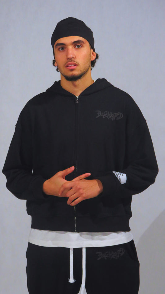 BLACK ON BLACK ZIP UP HOODIE